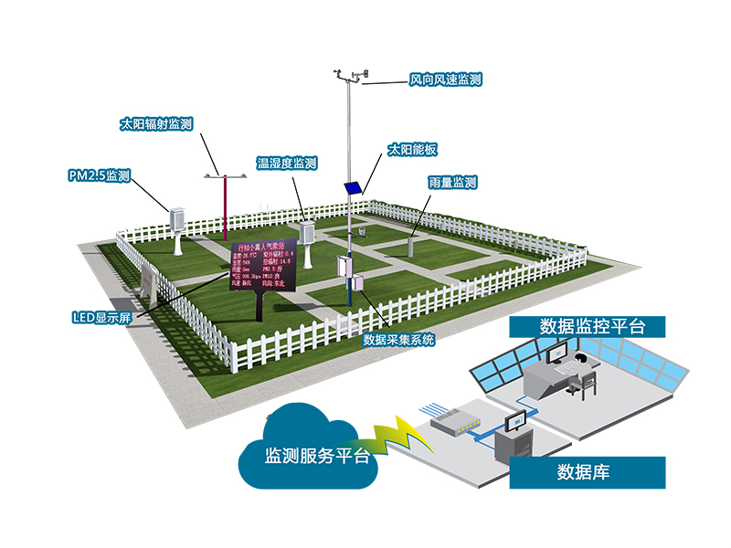 環(huán)境監(jiān)測站硬件設(shè)備,包括風(fēng)速、風(fēng)向、溫度、濕度、雨量、紫外線、PM2.5、甲醛、二氧化碳、噪聲等測量單元,交直流太陽能供電單元,數(shù)據(jù)通訊機(jī)處理單元。