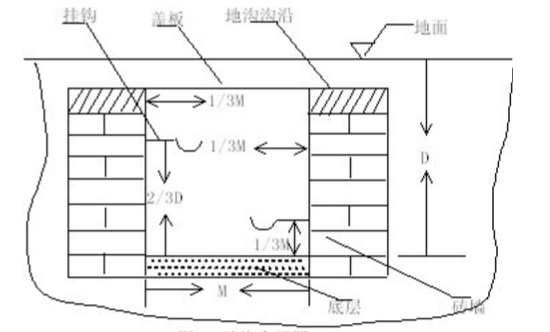 1.溝兩側應砌專墻,水泥勾縫。底部用磚砌成或混凝土或三合土夯實為厚5厘米的底層。地溝的上邊沿用水泥、鋼筋做邊,以增加強度。地溝的一個側面從溝底向上1/3D處,而另一面從溝底向上2/3D處,架設兩排金屬掛鉤,其間距為1米。兩排掛鉤的橫向位置是相互錯開的。金屬掛鉤是直徑5毫米的鋼筋。掛鉤端部的圓弧部分是直徑為9厘米的圓的1/3。另一方法:在地溝的兩個側面從溝底向上1/2D處橫向架設3cm寬的扁鐵,每隔1.5米~2米處架設一個。