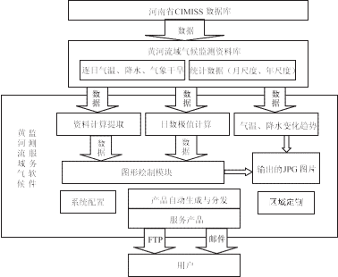 黃河流域氣候監測服務軟件提供資料計算與提 取、日數極值計算、 氣溫和降水變化趨勢分析、 圖形 繪制、產品自動生成與分發、區域定制等功能。